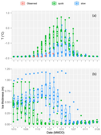 (a) Comparisons of simulated vs. measured surface water temperature. (b) Simulated trend of ice thickness at the PIPEX station from mid-October to end of January. Years are classified as quick/slow-melting. The observed temperature measured with the CTD in the 5–8 m layer (in red) are representative of a typical year of slow (or delayed) melting in the area. The date is coded as MMDD, from 13 October (1013) to 26 January (0126).