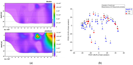 Phytoplankton community, PIPEX Station. (a) Benthic and pelagic diatom abundance in cell l−1, daily average. (b) Principal coordinate analysis based on counts, labelled as depth < 10 m and > 10 m and dates as phase “1” (up to 22 Nov) and phase “2” (from 25 November).
