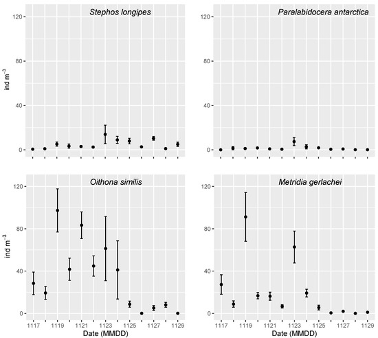 ) of the most abundant copepod species throughout the sampling period: (a) Stephos longipes, (b) Paralabidocera antarctica, (c) Oithona similis, (d) Metridia gerlachei. Note that naupliar stages NI and NII were not found for the species O. similis, which presented conversely copepodites (only CV) and male/female adults.