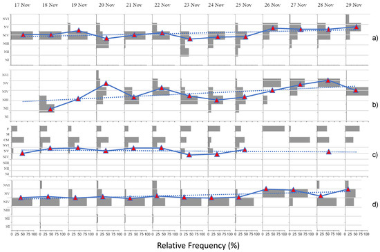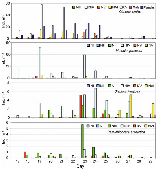 The abundances of nauplii oscillated considerably during the sampling period. Abundances of O. similis nauplii were higher from 19 to 24 November and decreased towards the end of the sampling period (Figure 8). Copepodite and adult abundances followed a similar trend, attaining peaks of 58.1 ind m−3, entirely linked to CV, and 27.6 ind m−3, on 19 and 23 November, respectively. M. gerlachei nauplii reached peaks of densities only on two sampling days (19 and 23 November) almost completely due to NIV; lower numbers occurred at the end of the sampling period. S. longipes naupliar abundances fluctuated between all sampling dates, with higher values of NIV on 24 and 25 November, that tended to decrease later when NV became dominant at the end of the sampling period. P. antarctica nauplii occurred with higher numbers only on 23 November; the abundances remained more constant during the other sampling dates, decreasing toward the end of the investigation period.