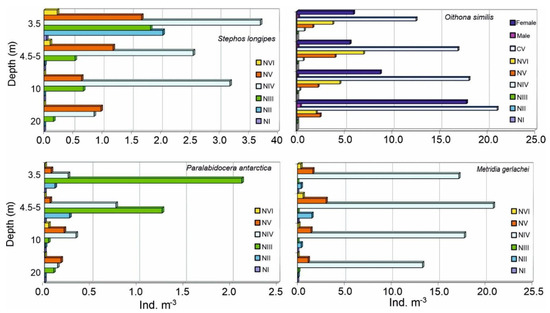 Naupliar stages of M. gerlachei were the dominant developmental form in the copepod assemblage—their total numbers ranged from 0.0 to 213.2 ind m−3. On average, their abundance reached a peak of 24.0 ind m−3 at 4.5–5 m depth, then gradually decreased to reach the minimum of 7.3 ind m−3 at 20 m depth under sea ice (Figure 9). Naupliar stages of S. longipes attained peak in abundances just under the ice at 3.5 m, with maximum mean density of 8.2 ind m−3; they seemed to decrease downward, reaching a minimum of 1.7 ind m−3 at 7 m depth and then increased again (up to 6.2 ind m−3) at 10 m under sea ice. However, they occurred throughout the 20 m water column, with absolute abundances ranging from 0.3 to 67.7 ind m−3. Paralabidocera antarctica nauplii occurred with higher mean abundances at 3.5 and 4.5–5 m depths (2.1 and 2.3 ind m−3, respectively) and negligible values below these depths. Their absolute abundances ranged from 0.1 to 31.3 ind m−3. Copepodites of this species also occurred, but with very low abundances distributed mostly between 3.5 and 4.5–5 m.