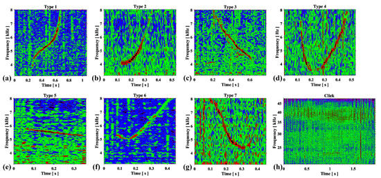 Spectrograms of whistle types (a–g) and click trains (h) produced by Taiwanese humpback dolphins in their natural habitat during the recording period.