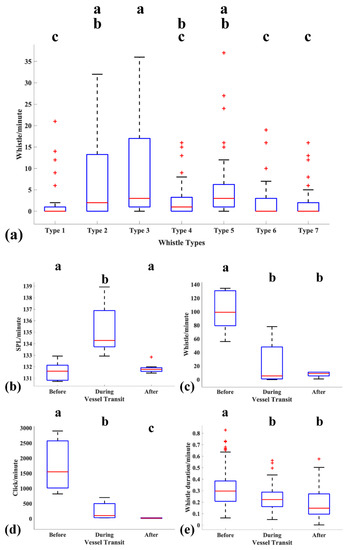 (a) Frequency of whistle types per minute (number of replicates in group, whistle Type 1–7; n = 16, 36, 45, 27, 49, 22, and 18, respectively). Effect of vessel transit (before [n = 9 min], during [n = 7 min], and after [n = 9 min]) on (b) Sound pressure level (SPL, dB re 1 μPa), (c) number of whistles, (d) number of clicks, and (e) whistle duration (s) within a minute. The central red mark on each box indicates the median, and the top and bottom edges of the box represent the 25th and 75th percentiles. The maximum and minimum values are marked in black at the extreme ends. The symbol ‘+’ indicates the outliers. Superscript letters represent results of the post hoc multiple comparison test; different superscript letters indicate significant differences (p < 0.05), with letter ‘a’ at the top, and subsequent statistical differences are represented at a lower level.