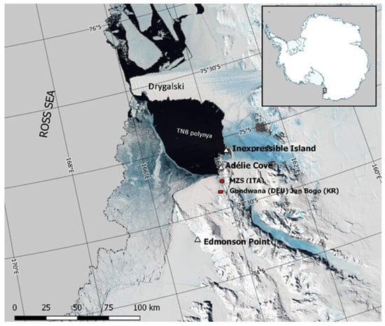 Marine predators, like Antarctic seabirds, have been recognized as key species in the identification, design, implementation, and monitoring of Marine Protected Areas (MPAs) [,,]. MPAs provide protection at both breeding sites and foraging areas for seabirds. Moreover, at a larger scale, MPAs can maintain connectivity between breeding and non-breeding sites and can guarantee the protection of potentially suitable refuge areas []. The Ross Sea region MPA came into force in December 2017. It covers 1.55 million km2 of ocean and protects a unique ecosystem and its marine species, biodiversity, and habitats [,]. The associated Research and Monitoring Plan [] requires multidisciplinary research on key species as indicated in the CCAMLR Conservation Measure Annex 91-05/C []. During 2017–2019, the Italian project PenguinERA investigated the ecological role of a marine predator, the Adélie penguin Pygoscelis adeliae, through the study of its distribution and behavior in relation to the quality of habitat, colony size, evolution, and adaptation at the scales of the ecological and climatic processes []. The study area involved three Adélie penguin colonies located between Terra Nova Bay and Wood Bay (Ross Sea, Antarctica). The existing long-term monitoring program was improved by measuring a series of different bioecological parameters to contribute to the Ross Sea MPA Research and Monitoring Plan [].