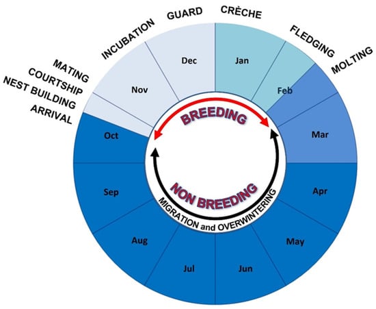 The annual life cycle of Adélie penguins is characterized by a short and highly synchronized breeding period (Figure 2). Penguins arrive at the breeding colonies from mid-October, with males arriving a few days earlier than females. Both parents share the task of incubating the eggs, alternating at the nest during the 32–34 days necessary for hatching. The chicks remain at the nest and are fed and protected up to about 22 days of age (guard phase). In the following period (crèche phase), chicks tend to leave the nest and gather in groups with chicks from nearby nests, returning to the nest area only to receive a meal from their parents. During this period the diet varies between locations, breeding stages, and supply areas. It consists of variable amounts of krill (Eupahusia superba and E. crystallorophias) and fish (Pleuragramma antarcticum and juvenile stages of Notothenioidei) []. Chicks leave the colony by the end of February at the age of 50–60 days (fledge phase). Parents and non-breeding adults may remain to molt at breeding colonies or leave earlier to molt at sea. Young Adélie penguins first return to their natal colony at 2–4 years of age, but rarely they attempt to breed on the first visit [].