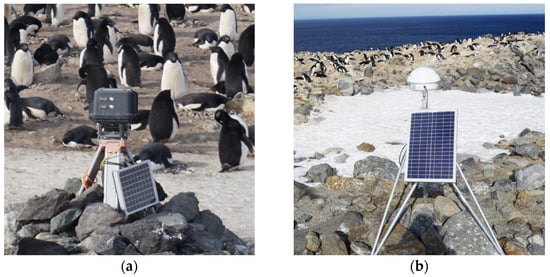 The deployment of two automated time-lapse cameras (Figure 4) aimed at recording penguin breeding phenology, also integrating data from field observations. A Penguin Nest Camera (PNC49) was installed at EdPo in December 2014 in collaboration with the Australian Antarctic Division [] as part of an international monitoring network []. A time-lapse imaging system, model Cyclapse Harbotronics was installed at AdCo at the end of the 2017/2018 season. The camera was provided by the ENEA Antarctica Technical Unit for Logistics Service and took a picture each 4 h during the breeding season. These instruments monitored an area including approximately 30 control nests. Observation made from available images recorded during the two breeding seasons helped in documenting phenology events at both colonies from October to February (first arrival, hatching, créching, fledging). For details on working periods of remotely-operated cameras, see Supplementary Material.