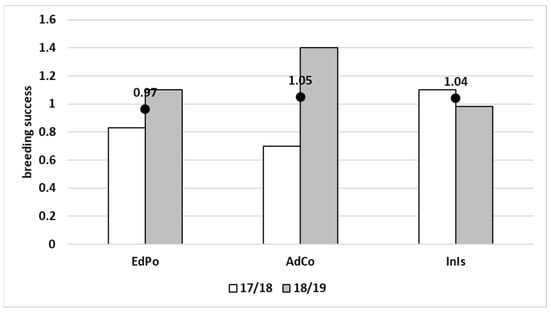 Breeding success for the three colonies in 2017/2018 (white bars) and 2018/2019 (gray bars). Black dot is the mean value across the two study years. Data for InIs in 2018/2019 were retrieved from [].