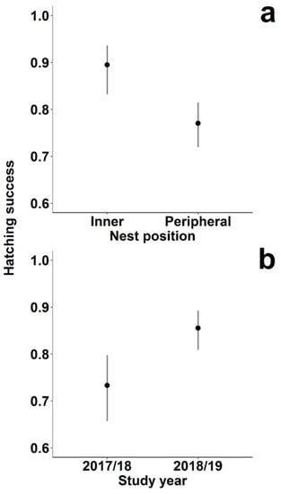 Effects of (a) nest position and (b) study year on the hatching success of Adélie penguins predicted by GLMs. Black dots: predicted values. Grey bars: 95% confidence intervals.