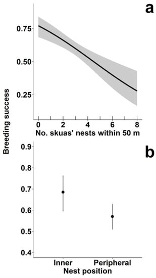 Effects of (a) number of skua nests within 50 m and (b) nest position on the breeding success of Adélie penguins predicted by GLMs. In (a), marks along the x-axis show the distribution of observed values. Black lines or dots: predicted values. Grey bands or bars: 95% confidence intervals.