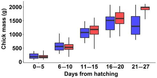 As for chick growth, we fitted a linear mixed model (LMM) to compare chick mass between EdPo and AdCo over five time periods during the chick-rearing phase in the year 2018/2019. These time periods were established arbitrarily between the hatching date and when chicks entered the crèche []: 0–5 days from the hatching date, 6–10 days, 11–15 days, 16–20 days, 21–27 days. We included the colony as a categorical predictor (reference level: AdCo), and time period and nest identity as crossed random intercepts to account for repeated measurements in the same period and on the same nest. The response variable, i.e., chick mass, was ln-transformed to improve model residuals.