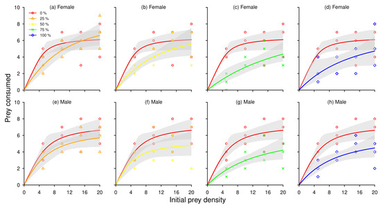 For both males and females, prey attack rates tended to fall concurrently with increasing habitat complexity (Table 1), whilst prey handling time effects were less consistently affected by habitat levels (Table 1). Bootstrapped attack rates and handling times differed significantly across habitat levels, an effect that significantly interacted with predator sex (a, χ2 = 211.51, df = 4, p < 0.001; h, χ2 = 1045.52, df = 4, p < 0.001). Confidence intervals were divergent and, thus, differences were statistically clear for female predators at 0% complexity compared to higher habitat levels (50%, 75%) at low–intermediate prey densities (i.e., functional response slope), and at 100% complexity at intermediate densities, yet they always overlapped across all treatments at high densities, indicating a lack of statistically clear differences (Figure 2a–d). For males, confidence intervals at 0% complexity were divergent and significantly different in relation to those at 75% under low–intermediate prey densities, and at 100% complexity at intermediate densities (Figure 2e–h). Confidence intervals for males always overlapped at the highest prey densities, indicating a lack of significant differences. Therefore, habitat complexity effects on predation were prey density-dependent, yet generally similar between predator sexes.