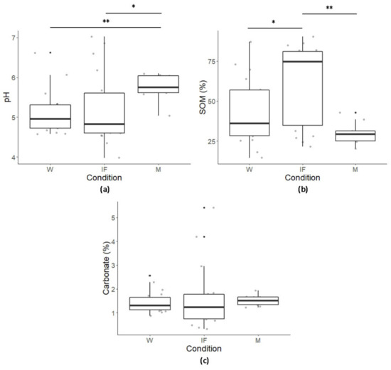 Differences between conditions for both pH and SOM were highlighted (p ≤ 0.01 for both; Figure 2a,b), but not for carbonate (Figure 2c), showing more alkaline conditions in M than in forests (p < 0.01 when compared to W; p < 0.05 when compared to IF), and a higher SOM content in IF than in W and M (p < 0.05, and p < 0.01, respectively).