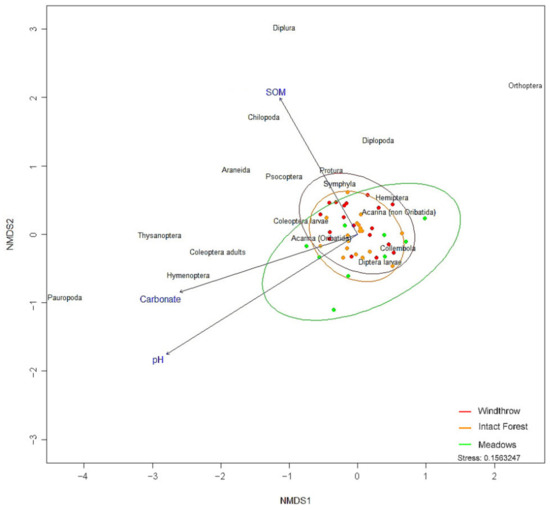 The OTUs driving the NMDS distribution of the samples were Chilopoda and Coleoptera adults (p ≤ 0.001, both), Araneae (p < 0.01), Diplopoda, Hymenoptera, and Thysanoptera (p < 0.05, all three taxa). SOM drove the site distribution pattern differently from pH and carbonate along the second axis.
