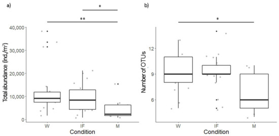 Boxplots of (a) total abundance (ind./m2) and (b) number of OTUs under each condition. The bottom and top of each box represent the lower and upper quartiles, respectively; the line inside each box shows the median and whiskers indicate minimal and maximum observations. Asterisks mean: * p ≤ 0.05, ** p ≤ 0.01.