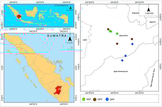 Sites of study inb Muara Enim District, Province of South Sumatera. NAF sites (green circles) represent natural forests, HPF sites (brown circles) represent plantation forests with the same location as the natural forests, and DPF sites (blue circles) represent plantation forests with different unit locations from the natural forests.