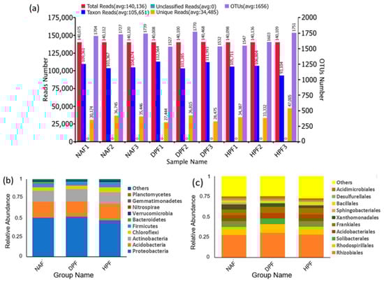 Bacterial annotation and abundance of soil samples. (a) The reads and OTU number statistics for each sample. The left vertical axis represents the read number, and the right vertical axis represents the number of OTUs (purple). (b) The relative abundance of the top ten phyla in each group. ‘Others’ represents the total relative abundance of the remaining phyla besides the top 10. (c) The relative abundance of the top 10 orders in each group. ‘Others’ represents the total relative abundance of the remaining orders besides the top 10. The relative abundance of phyla and order were not significantly different based on ANOVA (Supplementary of Table S1).