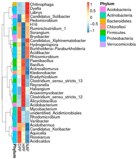 The relative bacterial abundances at the genus level were further analyzed. Figure 3 shows the heatmap of 35 most dominant genera identified. Acidothermus was the most dominant genus, followed by Candidatus_Solibacter, Acidibacter, and Variibacter, while Labrys and Geobacter were the least dominant. We categorized these genera based on the clustering results from the z value (Table S2). Based on the ANOVA result, the bacterial abundance was not significantly different for any genera, except for Mycobacterium (Table S3). The abundance of this genus was significantly higher in DPF than in NAF and HPF.