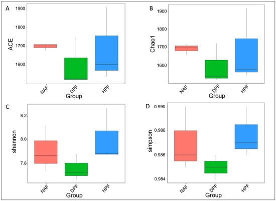 Alpha diversity index boxplots. The (A) Ace and (B) Chao1 indices describe the bacterial abundance in samples; the greater the ACE or Chao1 value, the higher the expected species richness. The (C) Shannon and (D) Simpson indices describe the bacterial diversity in samples; the greater the Shannon and Simpson indices of diversity, the higher the microbiome’s diversity.