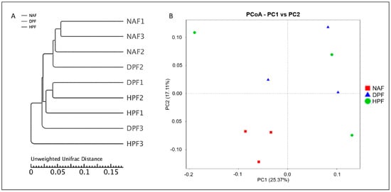 Beta diversity analysis was further used to evaluate intersample differences in species complexity. We performed cluster analysis to study the similarity between the samples. PCoA based on the distance matrix of the unweighted unifrac between the obtained samples is shown in Figure 5B, while the phylogenetic tree is shown in Figure 5A. Individual samples in the NAF group appear to be well clustered. However, the DPF and HPF samples were not grouped properly. In general, the samples from the natural forests form a different group from the samples from the plantation forests. All the HPF samples were in a different group from the NAF samples, while one DPF sample was in a group with an NAF sample. An ANOVA test for the unweighted unifrac distance indicated significant differences only between NAF and HPF (p < 0.05) (Table S5).