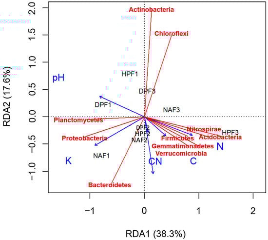 According to RDA (Figure 6), the K content had a strong positive correlation with the abundance of Bacteroidetes. This genus is abundantly found in natural forest, where K content is highest. This is confirmed in a previous study in which Bacteroidetes were found to prefer colonizing uncultivated soil [].