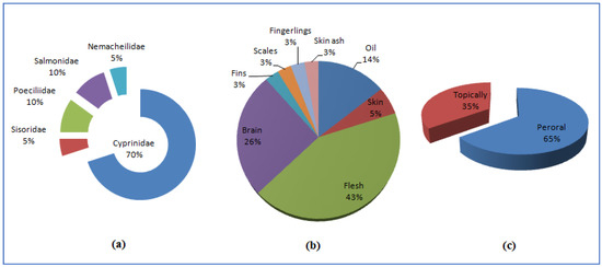 We found that flesh (43%) was the dominant part used by the local communities for medicinal purposes, followed by the brain (26%), oil (14%), skin (5%), scales (5%), fins (5%), skin ash (3%), and fingerlings (3%) (Figure 2b). The dominant usage of flesh can be related to the high importance in traditional medicine and the coexisting food value. Santos and Alves [31] reported the medicinal use of fish from Brazil, Orilogbon and Adewole [32] reported their use in southwest Nigeria, Altaf et al. [3] reported their use in Pakistan, and Singh [33] reported their use in Nepal. It is important to note that the use of fishes is high in winter compared with summer. It is believed that, apart from medicinal usage, fish has the potential to “warm the body”. Moreover, the shelf life of the medicine obtained from the fish is higher during winter. The data presented here for each of the quoted species, along with its zoological name, local name, family, parts used, and medicinal uses, are provided in Table 2. The mode of application to different body parts for treating a variety of diseases was mostly peroral (65%) followed by topical (35%) (Figure 2c).