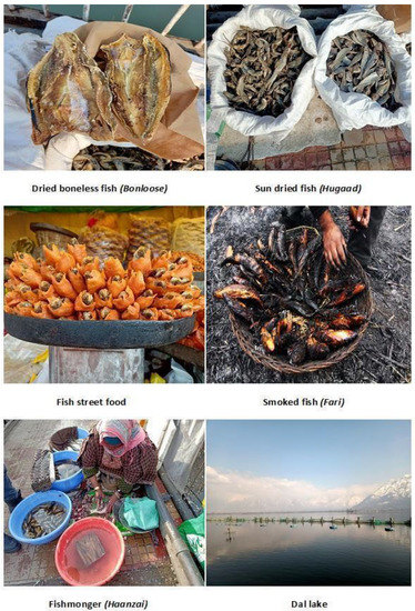 In the Vale of Kashmir, most people live in rural areas and are associated with agriculture and the allied sectors [18]. Very few people are associated with the fishing industry. These people are locally called Hanji/Haanz; sometimes, they are also called gaad vale (Figure 3). These people mostly catch the fish from the local water bodies as the source of their livelihood. The most prominent water bodies for fishing include Wular Lake, Dal Lake (Figure 3), Nigeen Lake, Manasbal Lake, Anchar Lake, Jhelum River, and Lidder River. WularLake is one of Asia’s largest lakes, also known as the fishing bowl of Kashmir [45]. It alone contributes 60% of the fish production in Jammu and Kashmir [46].The local people (Hanji/Haanz) sell these fishes in the markets (Figure 3). Even some women, locally known as Haazain, go to far off places to sell their catch. The most praised fishes in the valley include Schizopyge niger, Schizothorax plagiostomus, Schizothorax labiatus, Schizothorax esocinus, and Schizothorax curvifrons. These species are worth more than other quoted species. Moreover, fish have importance in Kashmiri street food, which is the livelihood of a variety of people. People love to eat fish, mostly deep fried after being marinated in powdered pulses or spices. People who sell these fishes are known as Munj vale. Some people sell barbecued fish, which provide a good source of income as well. Although fishery is burgeoning in the Vale of Kashmir, it is considered a low-income profession. Mainly poor people are associated with this mode of livelihood. The most critical factor that is affecting the profession (fishing) is the socioeconomic instability of the fishing (Hanji) community. For the proper development of the fishing industry, socioeconomic upgrades are needed [17].