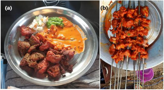 Over a century ago, Velben et al. [37] hypothesized that conspicuous consumption of expensive and superfluous foods is one of the courses of action by which the wealthy classes show off their wealth and power [38]. However, Bourdieu [39] suggested that the use of these products turns into a status symbol which spreads in different societies in a copycat fashion to obtain legitimation. In this ongoing process, the newly rich are the prime mimickers [40], and this phenomenon can be easily observed in societies which give prestige to rich people [41]. The inhabitants of Kashmir Valley, with their diverse cultures, have traditional legacies going through rapid urbanization and facing the rise of new opulent social groups [22]. The new social groups are generally marked by purchasing luxurious items and especially consuming foods outside conventional occasions such as marriages, festivals, and parties. The use of fish has now become a status symbol of the elite class. People consume fish in a variety of recipes such as barbeque, tikka, fish fry, mujgaad, and nadir gaad [22]. The eating of barbequed fish in the evening hours has become a display of high social status in the capital city of Kashmir. Some famous places in the city offer fish barbeque services at high prices, including Makai Park, Khayam chowk, Boulevard Road, and Dargah-Hazratbal (Figure 4a). The wealthiest people come into these places during the evening hours to enjoy expensive foods. Lower-class people also enjoy barbequed fish (Figure 4b) in home cooking.