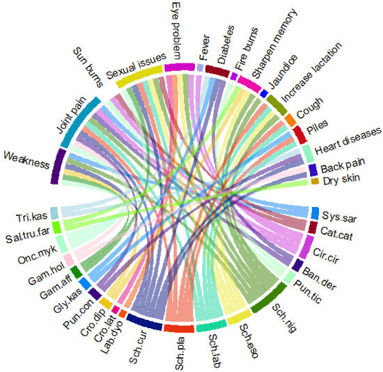 Species distribution for the treatment of specific diseases in the western Himalayan region of Kashmir. Complete names of the species are provided in Table 2.