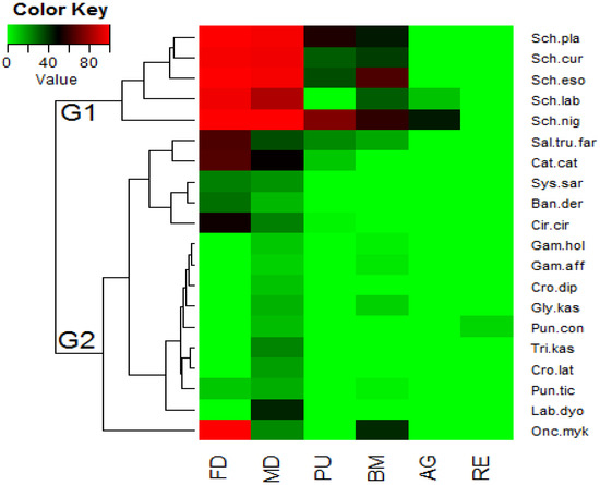 On the basis of the heat map analyses, two main primary clusters of six ethno-zoological categories of use (medicine, food, black magic, poultry, agriculture, and recreational) were recorded (Figure 6). The investigations classified the recognized groups on the basis of Sorensen’s similarity index between services offered and fish species. The first cluster(G1) included popular species (with a maximum frequency of citations) such as Schizopyge niger, Schizothorax curvifrons, Schizothorax esocinus, Schizothorax labiatus, and Schizothorax plagiostomus, which are used for food, medicine, black magic, poultry, and agriculture, whereas the second cluster (G2) contained species with the lowest number of citations that were used for different selected services. Alves et al. [5] reported three main clusters of fish usage in Northeast Brazil. Haq et al. [20] reported four main clusters in India.