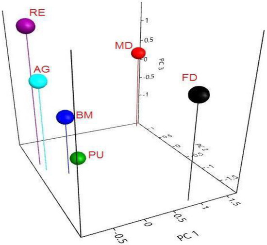 Principal component analysis (PCA), showing the positions of the dots relative to the components and showing how strongly independent variables are correlated with each other. The variables in the PCA were conducted for food (FD; black), medicine (MD; red), black magic (BM; blue), poultry (PU; green), agriculture (AG), and recreation (RE).