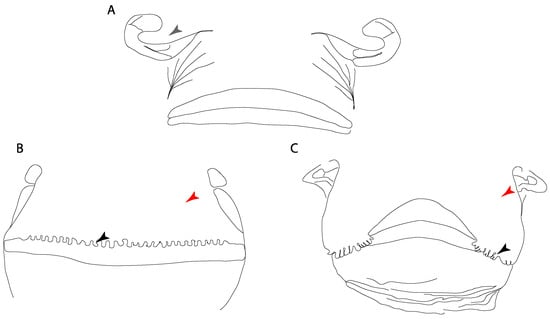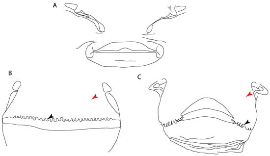Interpretative drawings of the mouth and nostrils. State (0): (A) Zapteryx xyster modified from McEachran et al. Text-Figure 1B in []. State (1) (B) Rhinoptera jayakari modified from Pradeep et al. Text-Figure 3A in [] and (C) Raja clavata modified from Steven Text-Figure 8 in []. Arrowheads: (red) nasal curtain, (back) nasal curtain fringes, (gray) anterior nasal lobe.