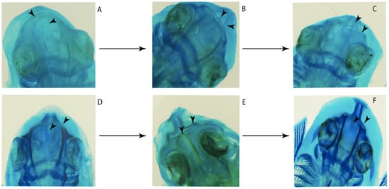 Figure 4. Generalization of the development of the rostral cartilages in Neoselachii using Zapteryx brevirostris (UREJ, unpublished data). (A–F) Letter sequences follow the order of the morphological development; arrowheads show the regions involved in the growth.