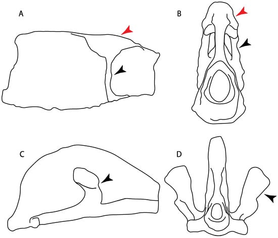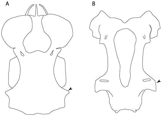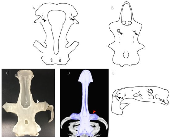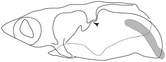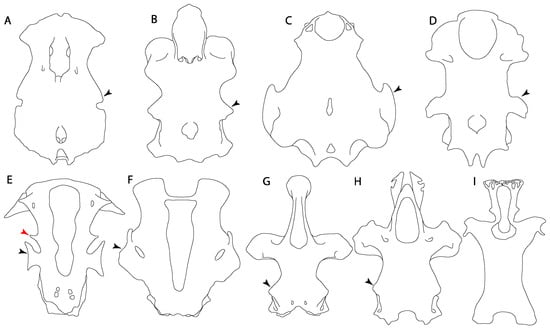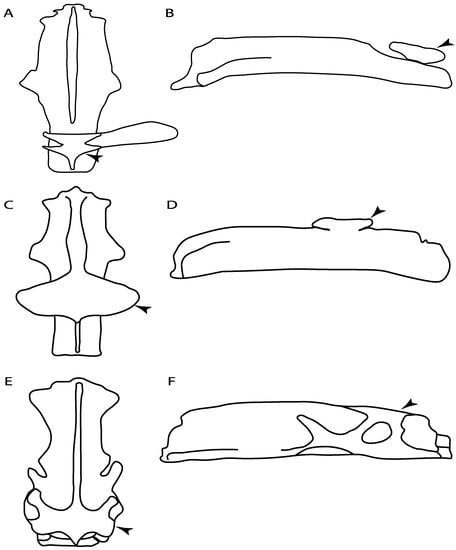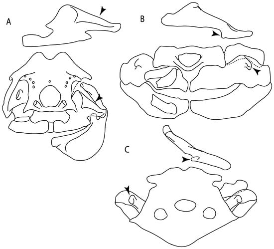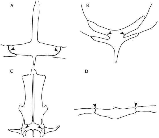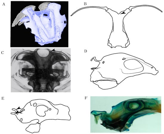 Figure 11. Neurocranium of selected Neoselachii. State (0): (A) Potamotrygon mototro (AMNH 97428, https://sharksrays.org/ (accessed on 23 March 2020)); (B) Squalus acanthias based on Thomas et al. Text-Figure 1 in []. State (1): (C) Zapteryx exasperata (CNPE-IBUNAM 20528); (D) Aptychotrema rostrata (CSIRO 101, https://sharksrays.org/ (accessed on 15 May 2020)); (E) Myliobatis tobijei based on Nishida Text-Figure 19 in []. Arrowheads indicate the position of the preorbital foramen.