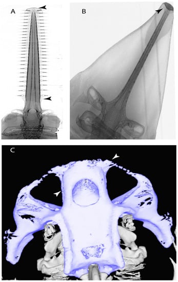 Rostrum of various Rhinopristiformes. State (1): (A) Pristis sp. (unpublished data); (B) Glaucostegus granulatus (NHMUK 2012.2.8.54); (C) Rhina ancylostoma (https://sharksrays.org/ (accessed on 23 March 2020)). Arrowheads indicate the rostral appendix at the base and tip or rostral cartilage.