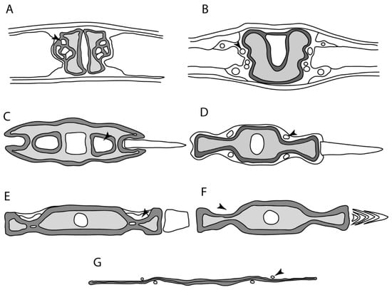 Figure 10. Interpretative line drawings of the lateral face of the neurocranium and sections of the rostral cartilages with the passage of superficial ophthalmic nerve in different chondrichthyan groups: State (0): (A) of Rhinobatos typus; (B) Aptychotrema rostrata based on Wueringer et al. Text-Figure 4 in []; (C) Pristis sp. (BRC–Pristis). State (1): (D) Pristiophorus nudipinnis based on Wueringer et al. Text-Figure 4 in []; (E) Onchopristis numidus based on Cappetta Text-Figure 4 in [] and Wueringer et al. Text-Figure 4, NHMUK PV P 75503 in []; (F) †Schizorhiza stromeri aster Smith et al. Figures 1a–l and 2a–f; NHMUK PV P 73625 in []; (G) Libanopristis hiram based on Cappetta Text-Figure 3 in []. Arrowheads indicate the passage of the superficial ophthalmic nerve through the ethmoidal region.