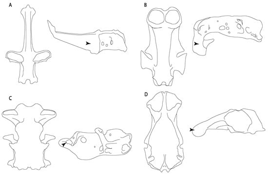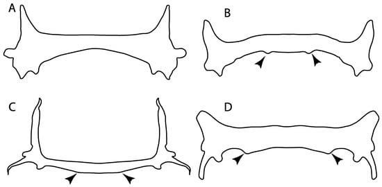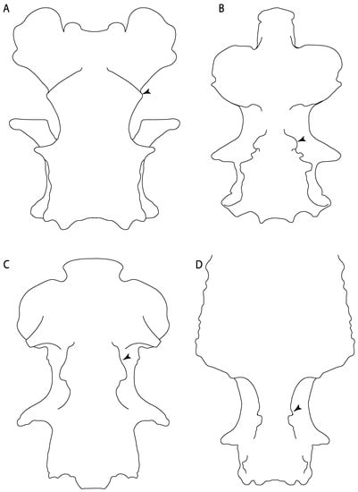Interpretative drawings of ventral and lateral view of the neurocranium in ventral and lateral view. State (0): (A) Rhinobatos glaucostigma (CNPE-IBUNAM 17810). State (1): (B) Myliobatis tobijei redrawn from Nishida Text-Figures 16A and 19D in []. State (2): (C) Squatina nebulosa (AMNH 258172, https://sharksrays.org/ (accessed on 5 May 2020)). State (3): (D) Heterodontus francisci. (AMNH 217862). Arrowheads indicate the nasal capsules.