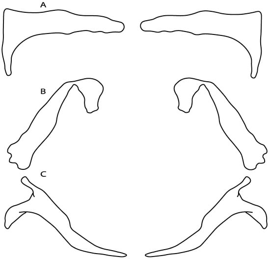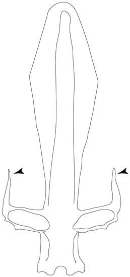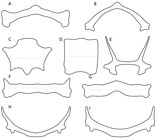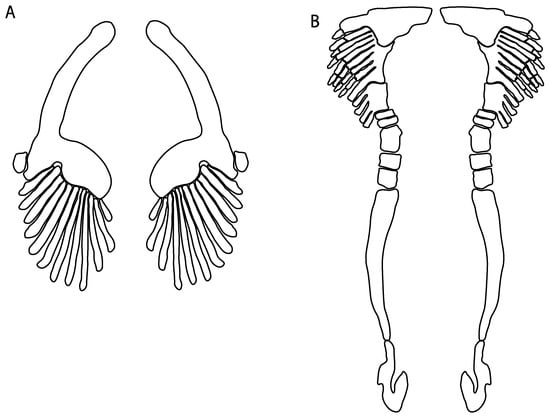 - Miyake, T.; McEachran, J.D. The morphology and evolution of the ventral gill arch skeleton in batoid fishes (Chondrichthyes: Batoidea). Zool. J. Linn. Soc. 1991, 102, 75–100. [Google Scholar] [CrossRef]