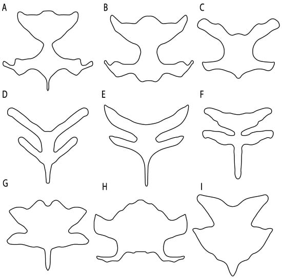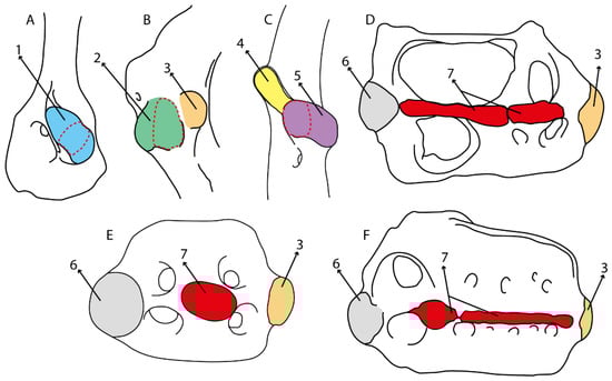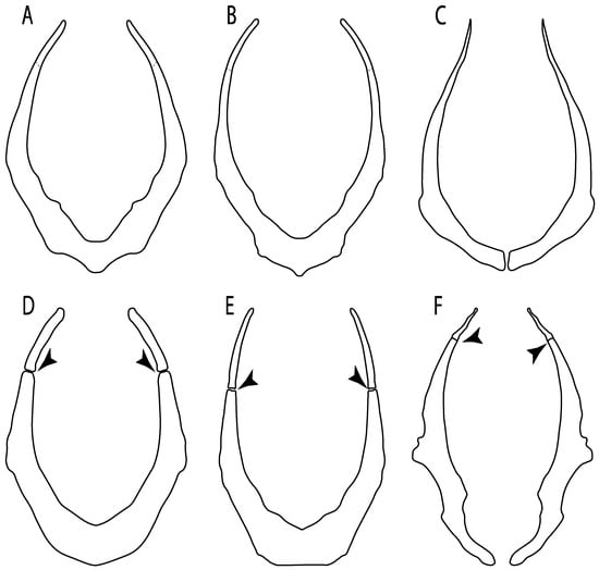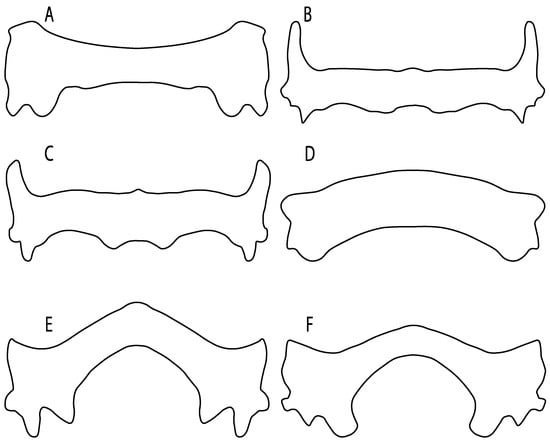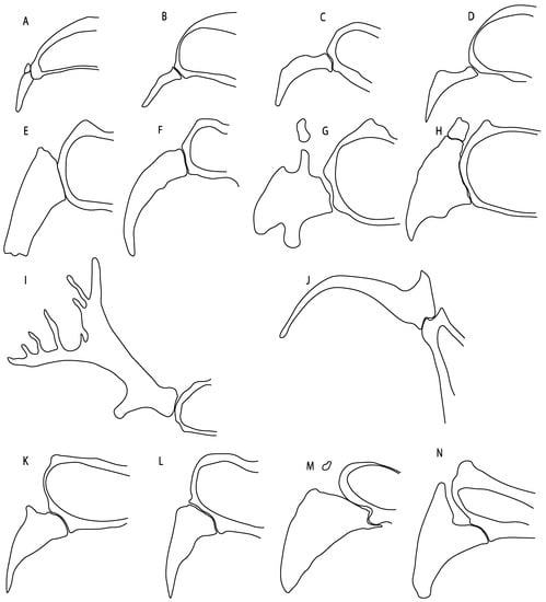 - Medial growth of rostral cartilage: (0) Inconspicuous; (1) conspicuous (noticeable). Modified from Aschliman et al. [] (char. 26), Villalobos-Segura et al. [] (char. 27) and Claeson et al. [] (char. 2). De Beer and Moy-Thomas [] named the cranial projections observed in chimaeroids (Figure 6A–C) as “medial and lateral rostral processes”. This nomenclature is kept by Claeson [] and used to recognize the structures on the rostral cartilages of electric rays. However, the topological homology of these structures is unclear. Because of this, we coded the medial growth of rostral cartilage in chimaeroids as inapplicable (-). The coding of this character for Ginglymostoma follows Motta and Wilga Text-Figures 8 and 9 in []. The character state is inconspicuous (0) for both Torpedo and Hypnos (Figure 6E,F); in Hypnos, the antorbital cartilages and nasal capsules support the anterior extension of the pectoral disc, and in Torpedo, the rostral cartilages seem to arise primary from the anterior wall of the nasal capsules and interact with the antorbital cartilages. In Narke, there are tripodal rostral cartilages with lateral and medial growths. Narcine also shows a noticeable development of its rostral cartilages. We consider the observations by Miyake [] in Urolophus, Urotrygon and Potamotrygon to be correct, as these taxa present evident vestiges of the rostral cartilages, such as those in Gymnura Text-Figure 1 in [], Text-Figure 1 in []. Aschliman et al.’s [] coding for Urobatis was kept, as we were unable to confirm the observations of Miyake et al. [] and McEachran et al. [] on the presence of these vestiges. Rhinoptera and Mobula (Figure 6F) present a lateral growth on the trabecula and lamina orbitonasalis to support the cephalic fins []. Zanobatus and †Plesiozanobatus show a small medial growth of the rostrum (Figure 6D). De Carvalho et al. [] noticed in specimens of †Asterotrygon (NHMUK P 61244; PF 15180) the rostral projections and medial growth. The rostral cartilages in †Heliobatis, Plesiobatis, Hexatrygon, Hypanus, Potamotrygon, Neotrygon, Aetobatus, Myliobatis, †Lessiniabatis, †Tethytrygon and †Promyliobatis are inconspicuous. The rostral cartilages in the most rajoids (not in Sympterygia), and in all sclerorhynchoids, extant and extinct platyrhinids and Rhinopristiformes, are noticeable.