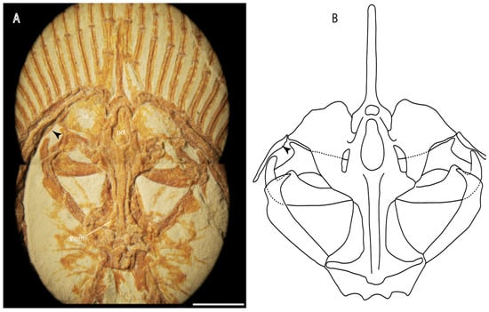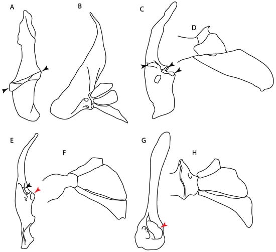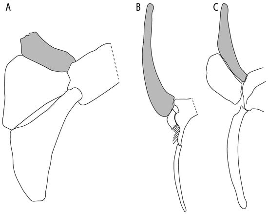 - Lane, J.A.; Maisey, J.G. Pectoral anatomy of Tribodus limae (Elasmobranchii: Hybodontiformes) from the Lower Cretaceous of northeastern Brazil. J. Vertebr. Paleontol. 2009, 29, 25–38. [Google Scholar] [CrossRef]