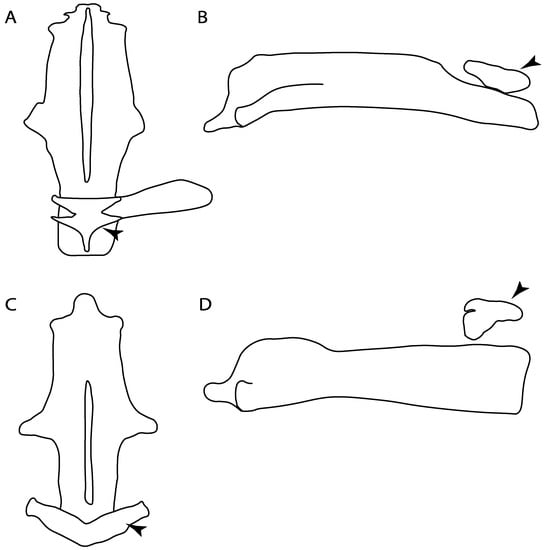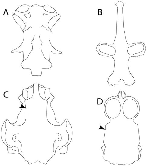 Neurocranium of selected torpediniforms: State (0): (A) Interpretative line drawing of Hypnos subnigrum (MCZ S985, modified from Claeson Text-Figure 3.17A in []. State (0 and 1): (B) Interpretative line drawing of Narke sp. (ZMB 33911, modified from Claeson Text-Figure 3.17J in []. State (2): (C) Narcine brasiliensis (CNPE-IBUNAM 9280); (D) Platyrhina triseriata (MNHN 4329). Arrowheads indicate the lateral rostral process.