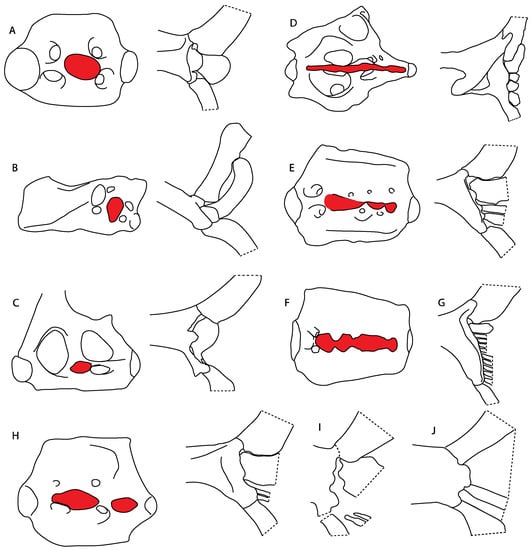 - Johanson, Z.; Trinajstic, K.; Carr, R.; Ritchie, A. Evolution and development of the synarcual in early vertebrates. Zoomorphology 2013, 132, 95–110. [Google Scholar] [CrossRef]
