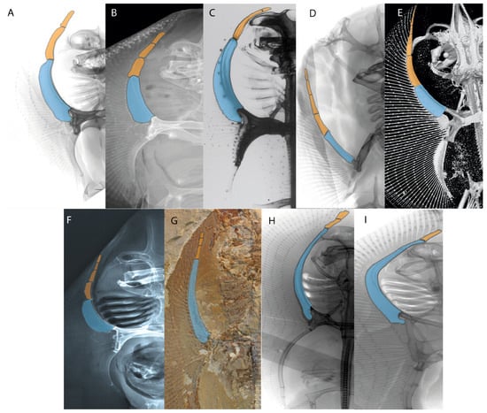 - Coates, M.I.; Gess, R.W. A new reconstruction of Onychoselache traquairi, comments on early chondrichthyan pectoral girdles and hybodontiform phylogeny. Palaeontology 2007, 50, 1421–1446. [Google Scholar] [CrossRef]