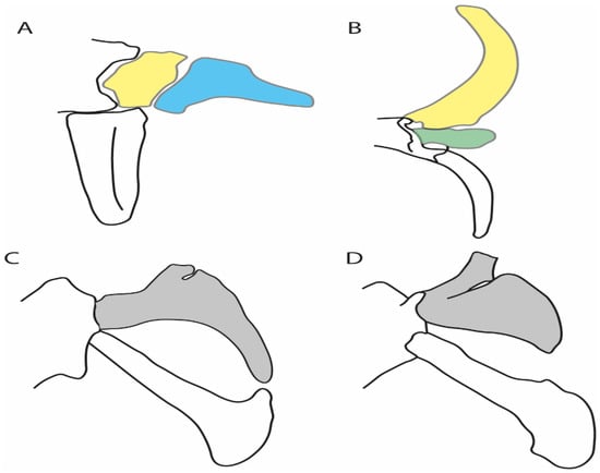 Variation on the development of the rostral cartilages among selected batoid taxa. (A) State (0): Pseudobatos lentiginosus (AMNH 8913), (B) Torpedo ocellata (AMNH 4128). State (1) (C) Urotrygon venezuelae (AMNH 55623). State (2) (D) Mobula munkiana (https://sharksrays.org/ (accessed on 15 March 2020)).