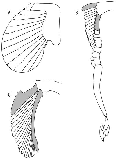 - Riley, C.; Cloutier, R.; Grogan, E.D. Similarity of morphological composition and developmental patterning in paired fins of the elephant shark. Sci. Rep. 2017, 7, 9985. [Google Scholar] [CrossRef] [Green Version]