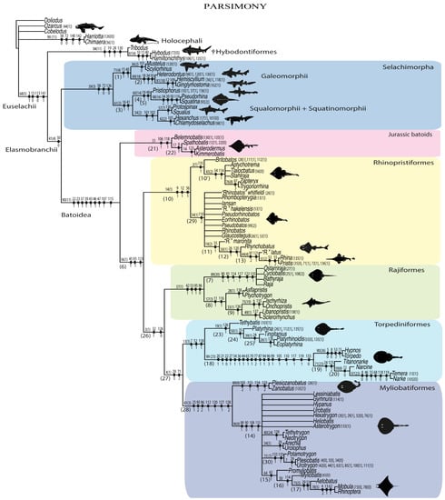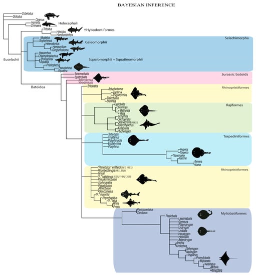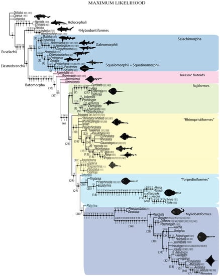 Following a growing body of evidence derived from extant and extinct batomorphs and chondrichthyans in general (e.g., [,,,,,,,,,,,,,,,,,,,,,,,,,]), the overarching goal of the present study is to evaluate our current knowledge and to provide new hypotheses about the phylogenetic relationships of batomorphs using morphological characters. Detailed interpretations of the characters are included here to serve as a reference for future morphological works and to subsequently facilitate the inclusion of elasmobranch fossils into phylogenetic analyses. Different analytical approaches are employed and discussed in the present study, providing a novel look at the phylogenetic relationships of batomorphs. The present analysis also explores the phylogenetic relationships of batomorphs with their closest relatives (i.e., sharks) by including several characters for the selachimorphs and additional outgroups (e.g., holocephalians, symmoriids and hybodonts, and also highlighting issues that require future study.