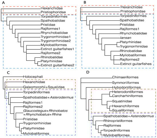 - Douady, C.J.; Dosay, M.; Shivji, M.S.; Stanhope, M.J. Molecular phylogenetic evidence refuting the hypothesis of Batoidea (rays and skates) as derived sharks. Mol. Phylogenet. Evol. 2003, 26, 215–221. [Google Scholar] [CrossRef]