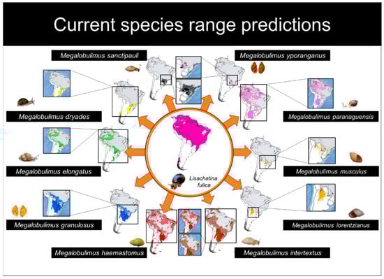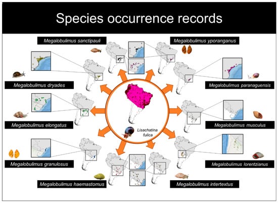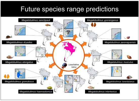 The following supporting information can be downloaded at: https://www.mdpi.com/article/10.3390/d14060467/s1, Table S1: Occurrence points of L. fulica; Table S2: Occurrence points of Megalobulimus species; File S3: Script of SDM; File S4: Environmental niche analysis of L. fulica and Megalobulimus species.