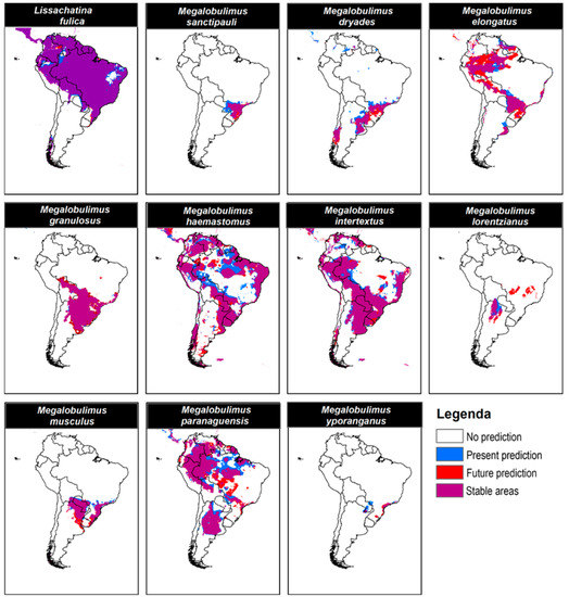 The genus Megalobulimus is probably one of the groups most highly threatened by many factors, such as anthropogenic pressures and climate change [34,35,36]. In this respect, our results reinforce that this group is of great concern, as six species have their suitable areas reduced. Moreover, an expected distributional shift to higher latitudes due to climate change [36,75,76] was not detected, with a loss of connection between populations (Figure 5), especially in south and southeastern Brazil and the frontiers between Brazil, Argentina, and Paraguay. This situation is expected, since land snails, in general, are a group with low dispersal abilities [34,77]. Thus, our results show a decline in Megalobulimus species that needs to be monitored in more detail to prevent the loss of future local populations and species extinctions.
