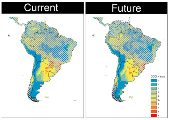 Potential species richness distribution of Megalobulimus species in the current and future scenarios. Locations with low species richness are shown in blue, whereas locations with high species richness are shown in red. The potential distribution of Lissachatina fulica in both scenarios is hatched.