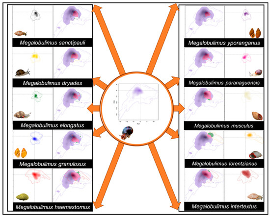 More recently, with the increasing availability of climatological and species occurrences data, it became possible to evaluate the potential effect of invasive species on native varieties on macroecological scales—such as the case of L. fulica and the Megalobulimus snails. At the same time, further developments of niche and species distribution modeling (SDM) allow researchers to test ecological processes on large spatial scales [37,38]. SDMs can be used to test hypotheses regarding the conservation of native species, the management of invasive species [39], or the detection of areas that can be potentially invaded [39,40]. SDM analyses can also show how species distributions change over time [41].